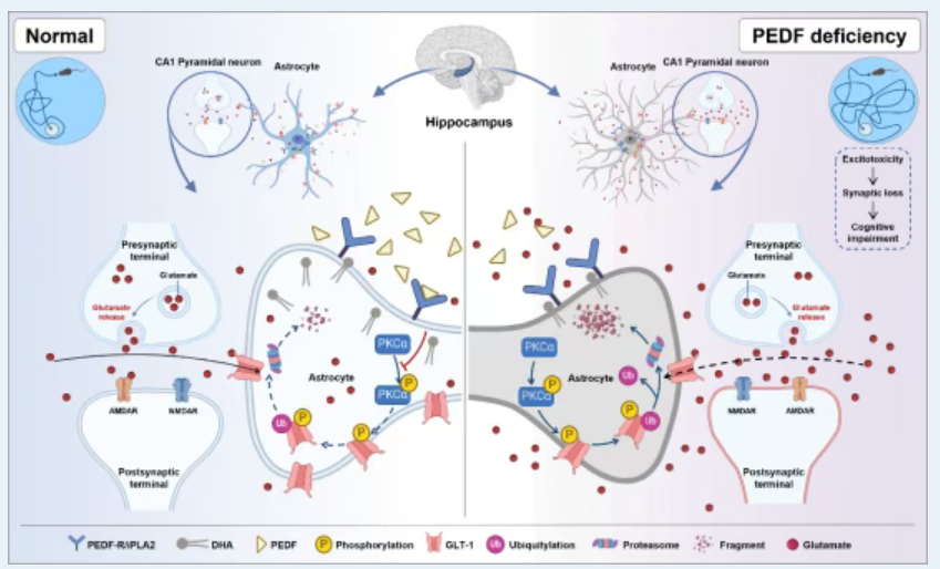维持谷氨酸稳态对突触可塑性和认知至关重要。谷氨酸-谷氨酰胺循环紊乱会导致慢性兴奋性毒性,这是阿尔茨海默病 (AD) 认知缺陷的关键驱动因素,但其调控机制尚不清楚。9月14日,中山大学齐炜炜副教授、高国全教授、杨霞教授、李勃兴教授共同通讯在Advanced Science 在线发表题为“Pigment Epithelium-Derived Factor Deficiency Impairs Hippocampal Glutamate Homeostasis and Cognitive Function by Downregulating Astrocytic GLT-1”的研究论文。对 19 名 AD 患者和 75 名非痴呆对照受试者的外周血样本进行分析,结果显示患者体内 PEDF 水平较低,且 PEDF 缺失与认知能力下降相关。PEDF 缺乏的小鼠表现出学习和记忆缺陷,并且更容易患 AD。此外,PEDF 缺乏还会损害突触可塑性和树突棘形态。从机制上讲,PEDF 抑制泛素-蛋白酶体依赖的星形胶质细胞谷氨酸转运体-1 (GLT-1) 降解,并通过调节蛋白激酶 C 信号通路正常地保证突触谷氨酸的清除。令人惊讶的是,恢复 PEDF 可挽救 AD 小鼠模型的认知缺陷,而上调 GLT-1 可挽救 PEDF 缺陷小鼠的认知障碍。总而言之,这些发现表明 PEDF 是突触谷氨酸稳态的生理调节剂。靶向PEDF 缺陷引起的神经损伤,可能为开发与谷氨酸诱导的兴奋性毒性相关的神经退行性疾病的新型治疗应用提供新的途径。