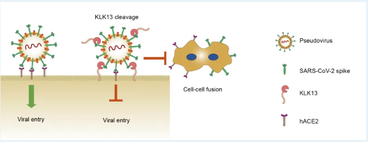 近日,中山大学中山医学院张桂根团队及合作者在mBio 在线发表题为 “Nasal mucus-derived KLK13 restricts SARS-CoV-2 infection via proteolytic cleavage of spike” 的研究论文。KLK13(激肽释放酶相关肽酶 13)在健康人群和新冠患者的鼻腔黏液样本稳定存在。KLK13 作为一种丝氨酸蛋白酶,可直接切割新冠病毒刺突蛋白,且该切割具有高度特异性。此外,KLK13能高效切割不同冠状病毒的刺突蛋白,进而阻断细胞进入及合胞体的形成,展现出广谱抗冠状病毒的潜力。在动物实验中,通过重组腺相关病毒(AAV-KLK13)鼻腔递送KLK13,可显著降低 K18-ACE2 转基因小鼠肺部和鼻腔中的新冠病毒载量,同时减轻病毒引起的炎症浸润和组织损伤。该研究首次发现鼻腔黏液来源的 KLK13可作为“剪刀”,切割病毒刺突蛋白阻断病毒感染,为开发新型呼吸道病毒抗病毒药物提供了新的思路。此项工作系中山大学中山医学院张桂根团队与香港大学李嘉诚医学院袁硕峰团队合作完成,中山大学研究生曹文颖、郑宁泽(已毕业)及香港大学研究生曹翯翯为共同第一作者;袁硕峰、张桂根为共同通讯作者。