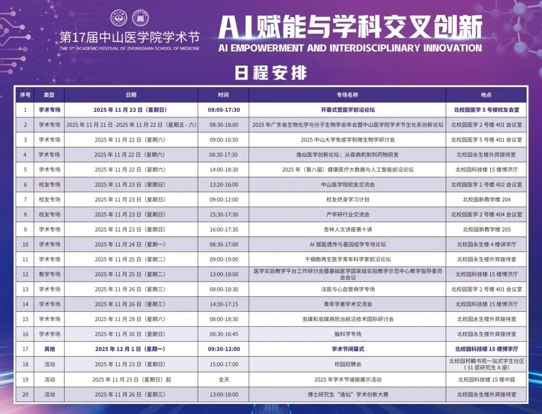 中山大学中山医学院第17届学术节将于2025年11月23日至11月30日隆重举行。作为学院历史悠久的传统学术盛事,学术节始终秉承“救人救国救世,医病医身医心”的初心,融汇百年医学底蕴与前沿创新精神,致力于推动学科交叉与科研突破,构建中国特色医学教育的发展路径。