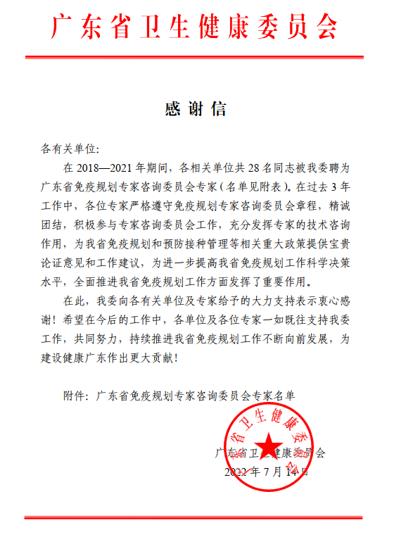 我中心法医病理鉴定室主任罗斌教授在2018—2021 年期间,被广东省卫生健康委员会聘为广东省免疫规划专家咨询委员会专家。在过去3 年,罗斌教授严格遵守免疫规划专家咨询委员会章程,积极参与专家咨询委员会工作,充分发挥专家的技术咨询作用,为我省免疫规划和预防接种管理等相关重大政策提供宝贵论证意见和工作建议,为进一步提高我省免疫规划工作科学决策水平,全面推进我省免疫规划工作方面发挥了重要作用。